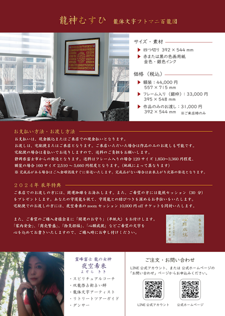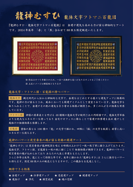 『龍神むすひ - 龍体文字フトマニ百龍図』は、金運や運気を高める力が宿る神秘的なアート。
