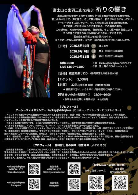 富士山と出羽三山を結ぶ流れの中で、今ここにしかない音と舞を、ご一緒に体感いただけたら嬉しいです。